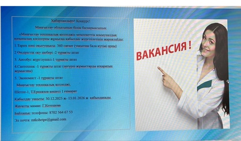 ХАБАРЛАНДЫРУ «Маңғыстау облысының білім басқармасы Маңғыстау техникалық колледжі» МҚКК 2025-2026 оқу жылында Қазақстан Республикасы Оқу-ағарту министрінің 2025 жылғы 31 наурыздағы № 57 бұйрығын негізге ала отырып, келесі бос және уақытша бос пән оқытушы лауазымдарына орналасуға конкурс жариялайды. Бос жұмыс орындары туралы хабарландырулар Instagram, Facebook әлеуметтік желілеріне, «Enbek.kz» және колледждің ресми сайтына жарияланады. Еңбекақы мөлшері: біліміне,…