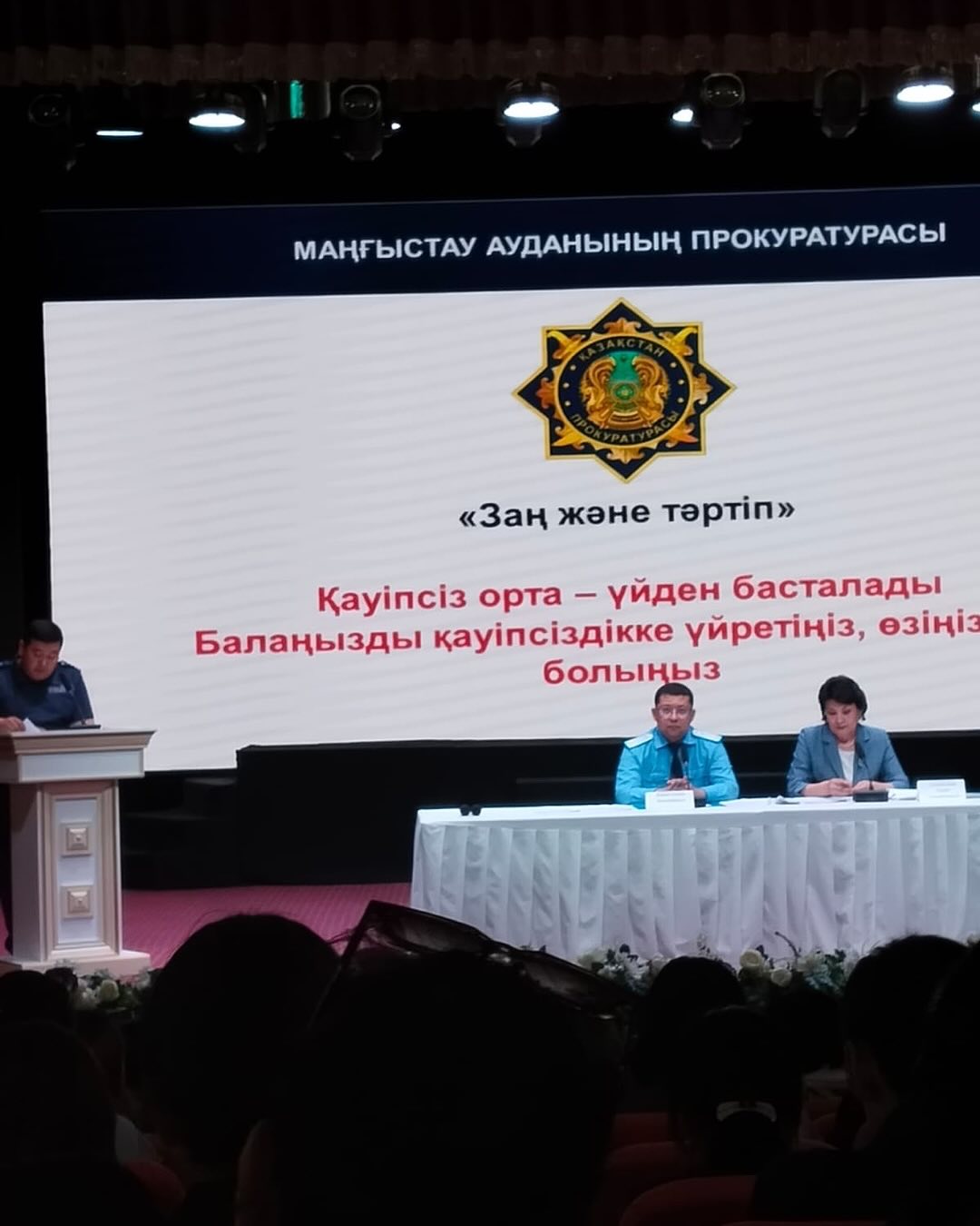 21 мамыр күні «Заң және тәртіп» тақырыбында аудандық мәдениет үйіндегі жиналысқа ата-аналар қатысты.Мақсат-құқық бұзушылықтың алдын алу, балалар қауіпсіздігін қамтамассыз ету. Аудан прокуроры А.Кошев ,аудан әкімінің орынбасары Т.Алтынғалиев балалар қауіпсіздігін қамтамассыз ету жолдары ,құқық бұзушылықты болдырмау жолдары жөнінде ақпараттар берді.