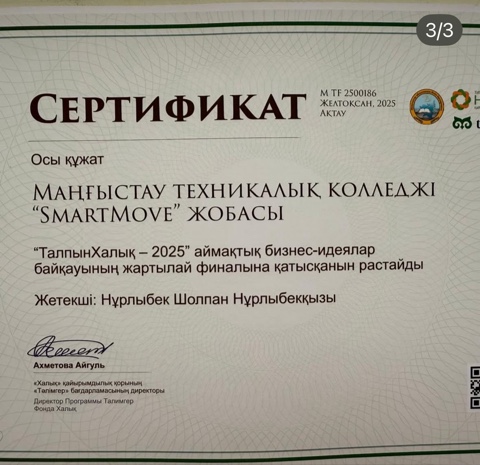 Маңғыстау облысы аумағында «Тәлімгер» білім беру саласындағы әлеуметтік бастамалар мен инновацияларды қолдау қоғамдық қоры «Халық» қайырымдылық қорының қолдауымен ұйымдастырған «Талпын Халық- 2025» байқауында Маңғыстау техникалық колледжінің студенті Саналиев Рамазан, ғылыми жетекшісі Нұрлыбек Шолпан жартылай финалға өтіп сертификатталды.